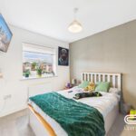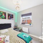 This beautifully presented double bedroom offers a contemporary and calming atmosphere, perfect for relaxation. The deep green feature walls create a sophisticated and cosy ambiance, complemented by stylish LED accent lighting. A large window allows natural light to flood the space, enhancing the bright and airy feel. With ample space for a double bed and additional furnishings, this versatile room is ideal as a primary bedroom, guest room, or stylish home office.