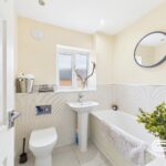 A beautifully presented and contemporary family bathroom, designed with both style and functionality in mind. Featuring a sleek white suite comprising a bathtub with tiled surround, a modern wall-mounted flush WC, and a pedestal washbasin. The neutral tones and stylish fittings create a calming retreat, while the frosted window allows for natural light while maintaining privacy. A perfect space to relax and unwind after a long day.