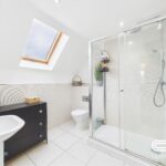 This beautifully appointed en-suite shower room offers a sleek and contemporary design, featuring a spacious walk-in shower with a rainfall showerhead for a touch of luxury. A stylish pedestal sink, modern WC, and elegant tiling create a fresh and sophisticated atmosphere. The skylight allows natural light to flood the space, enhancing the airy feel, while additional storage provides practicality. A perfect complement to the impressive master suite.