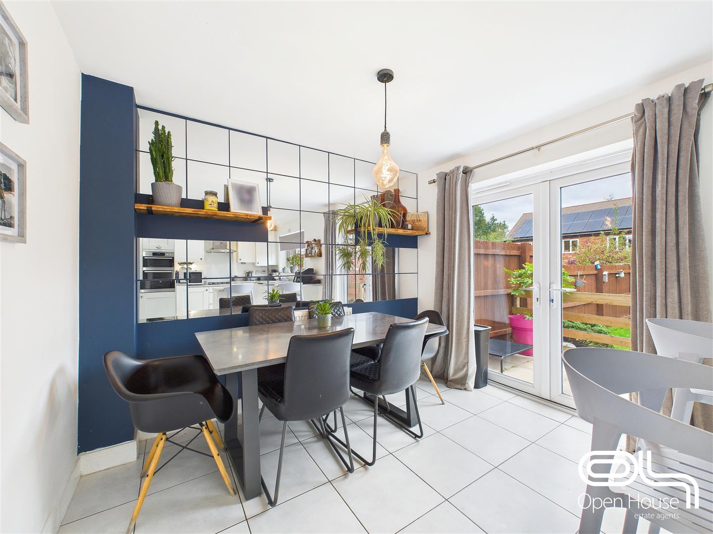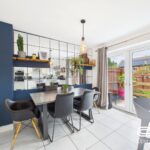 The adjacent dining area is perfect for entertaining, featuring a striking feature wall with floating shelves and a contemporary oversized clock. French doors open directly onto the garden, seamlessly blending indoor and outdoor living. Whether hosting dinner parties or enjoying a quiet morning coffee, this space is both functional and inviting.