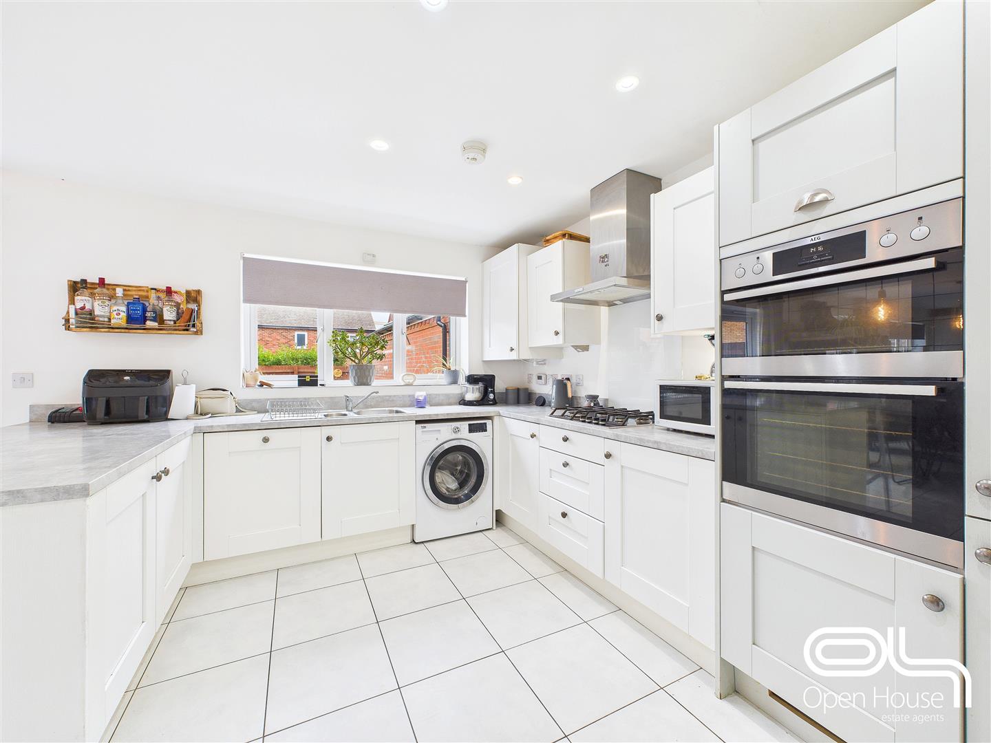 Designed for modern living, this beautifully presented open-plan kitchen and dining space is the heart of the home. The stylish kitchen is fitted with sleek white cabinetry, high-end integrated appliances, and ample countertop space, making meal preparation a delight. A large window allows natural light to flood in, offering views of the rear garden, while recessed lighting creates a warm ambiance.
