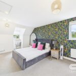 This beautifully presented double bedroom offers a contemporary and calming atmosphere, perfect for relaxation. The deep green feature walls create a sophisticated and cosy ambiance, complemented by stylish LED accent lighting. A large window allows natural light to flood the space, enhancing the bright and airy feel. With ample space for a double bed and additional furnishings, this versatile room is ideal as a primary bedroom, guest room, or stylish home office.