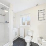 This en suite bathroom offers a shower and modern fittings, styled simply in neutral tones for ease of use and upkeep.