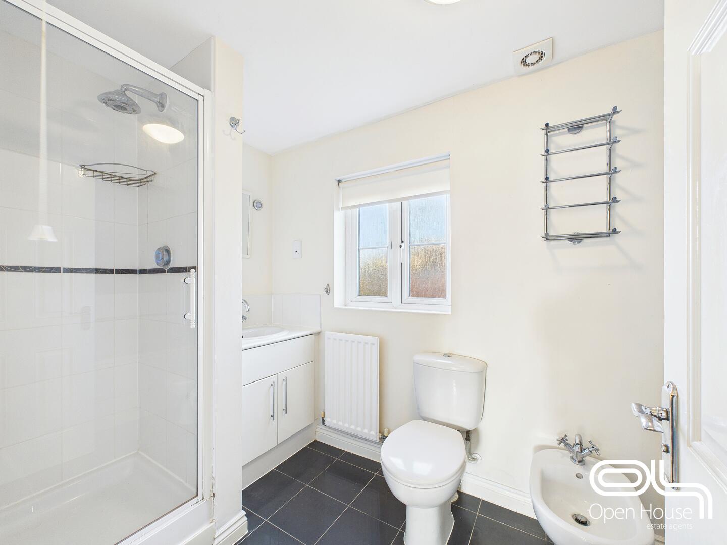 The en suite bathrooms are fitted with showers and modern fixtures, finished in neutral tones. They provide privacy and convenience to the master and second bedrooms.