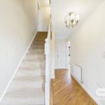 This welcoming hallway features wooden flooring and neutral walls, creating a bright and airy entrance to the home. A staircase leads to the upper floors, with doors providing access to the main living areas on the ground floor.