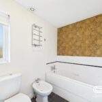 The house has a family bathroom with a bathtub, tiled flooring and neutral walls, brightened by a window. It provides a clean and fresh environment suitable for everyday use.