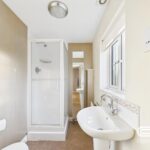 A bathroom on the first floor with a shower, white suite and neutral walls. The window provides natural light and ventilation, creating a bright, fresh space.