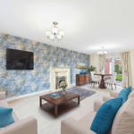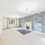 The lounge diner is a spacious and inviting room filled with natural light from windows and glass doors opening to the garden. It showcases a feature wall with floral wallpaper in blue tones and a traditional fireplace with a stone surround as a focal point. The carpeted flooring and neutral walls enhance the sense of warmth and comfort, making it perfect for relaxing or entertaining.