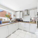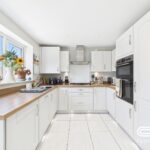 This kitchen is modern and bright with white high-gloss cabinetry contrasting against natural wood-effect worktops. It is fully fitted with integrated appliances including an oven, hob, and extractor fan. The tiled floor in a pale shade complements the room’s fresh, clean look. Large windows and glazed double doors to the rear garden allow plenty of natural light to flood in, creating a bright and welcoming cooking and dining space.
