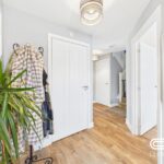 A welcoming hallway featuring a light wood-effect floor and white walls, creating a bright and airy entrance. There is a coat stand adding a practical touch for outerwear storage, while several doors lead off to the living room, kitchen, and ground-floor WC, with stairs ascending to the first floor.