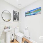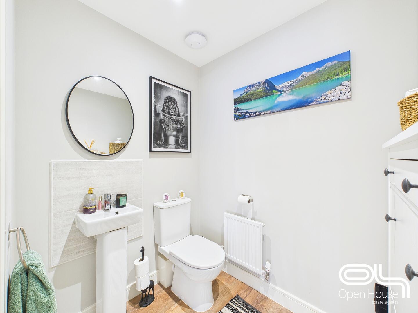 The ground floor WC is a neat and practical space with light walls and a white suite comprising a toilet and a small wash basin set into a tiled splashback. A wall-mounted mirror and a radiator complete the room with clean, contemporary styling.