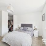 The main bedroom is a serene and spacious retreat with a large double bed dressed in soft grey linens, flanked by bedside tables. Ample natural light pours in from a window, illuminating the room’s neutral décor and soft carpeting. A walk-in wardrobe area offers generous storage and keeps the space uncluttered and restful.