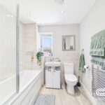 The family bathroom offers a modern feel with a bath and shower above, white tiled walls and a contemporary sink and toilet. A large mirror and a window provide brightness and reflect the clean lines and neutral palette of the room.