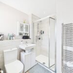 The ensuite bathroom is fitted with a walk-in shower, white sanitary ware, and a modern heated towel rail. Light neutral tiling and a window make this a bright and practical space.