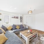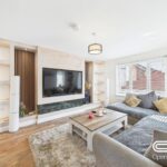 Spacious and bright, the living room is designed for comfortable relaxation and entertainment. It features a large L-shaped grey sofa adorned with mustard cushions, set upon a soft, shaggy rug. A contemporary feature wall houses a mounted TV with integrated shelving on either side for display or storage. Large windows allow plenty of natural light, contributing to the room’s inviting atmosphere.